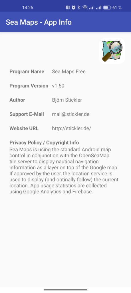 Die SeaMaps App verwendet Google Firebase, um App Nutzungs- und Absturztatistiken aufzuzeichnen. Werbe-Einblendungen in der App erfolgen über das AdMob Werbenetzwerk, welches ggf. ebenfalls Nutzungsstatistiken erfasst. Beide Systeme sammeln und übermitteln den sogenannten Android Advertising Identifier, eine eindeutige Geräte-ID (die in den Android Einstellungen zurückgesetzt werden kann). Die App ermöglicht zudem einen Opt-Out für die personalisierte Werbung. Sofern Sie irgendwelche Fragen in Bezug auf den Datenschutz haben, können Sie mich gern über die im Impressum genannte Adresse kontaktieren.